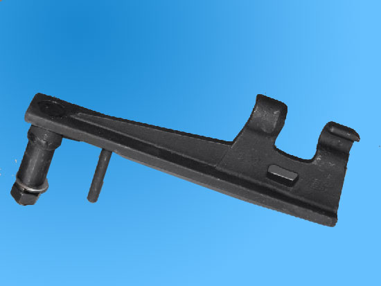 卡鉗式抱索器入繩導入裝置,由兩塊靠近形成引導槽的導板構成。本實用新型具有如下的有益效果,由于在礦用索道靜態上車裝置上裝有卡鉗式抱索器入繩導入裝置,當抱索器在軌道上滑行過程中抱索器上的卡鉗在引導槽中運行,不會產生擺動,使卡鉗準確的導入鋼絲繩,在抱索器離開軌道后,卡鉗能卡緊在鋼絲繩上,避免造成抱索器掉繩的安全事故。度內坡度,新型卡鉗式抱索器采用35錳鋼鑄造,強度和柔韌性都比以往抱索器有很大提高,卡鉗式抱索器適應范圍廣,摘取方便.